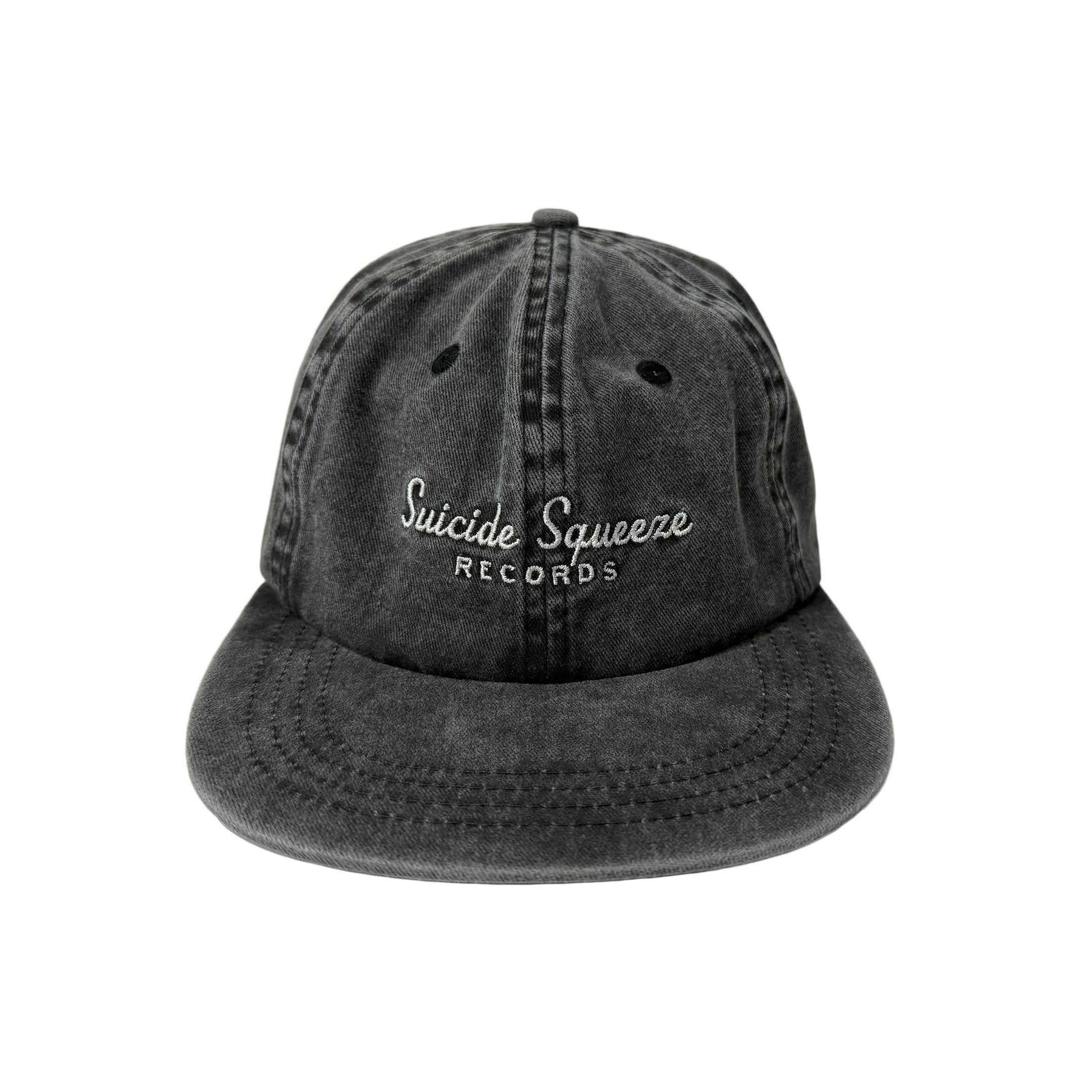 Suicide Squeeze Records Baseball Hat on vintage black with white lettering.